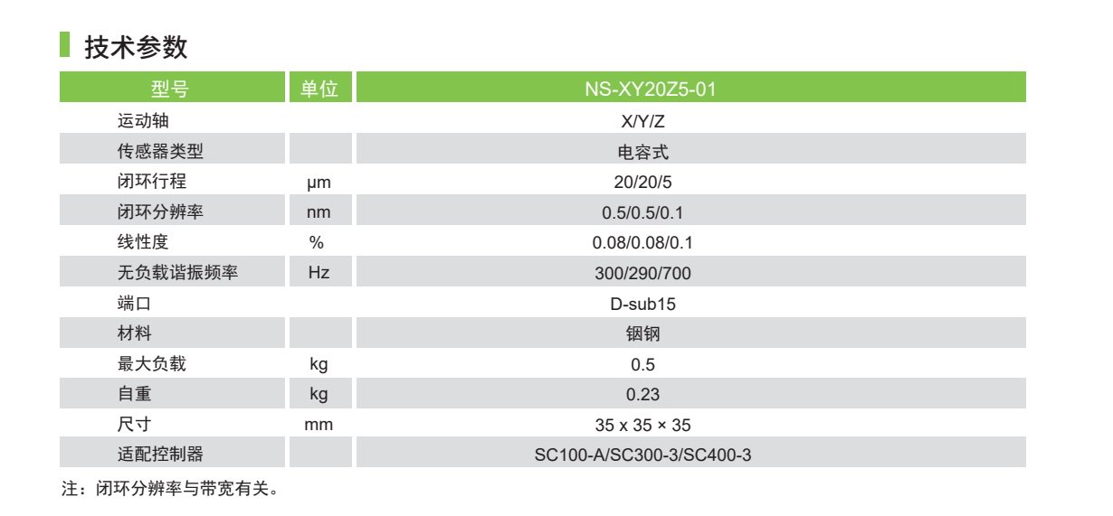 NS-XY20Z5-01是專為AFM應(yīng)用設(shè)計的高精度三維納米定位平臺。針對AFM應(yīng)用,該運動臺具有較大的XY軸行程和較快的 Z軸運動。行程 20/20/5μm ,分辨率0.5/0.5/0.1nm。